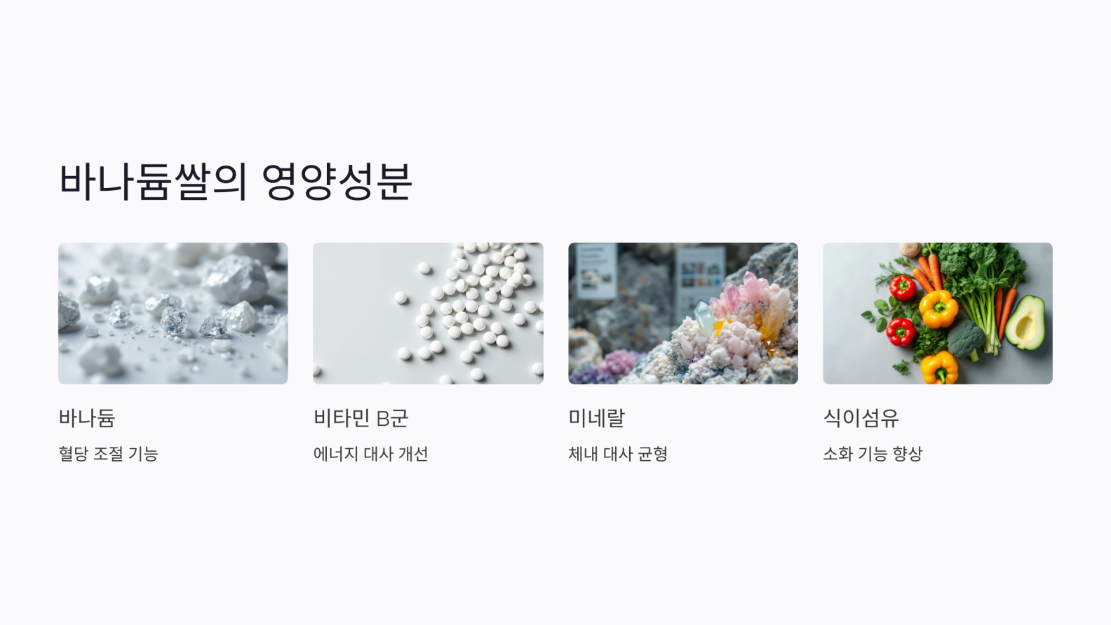 - 🍚 혈당 조절: 바나듐은 인슐린 유사 작용으로 혈당 상승을 완화해 당뇨 예방 및 관리에 도움을 줍니다.